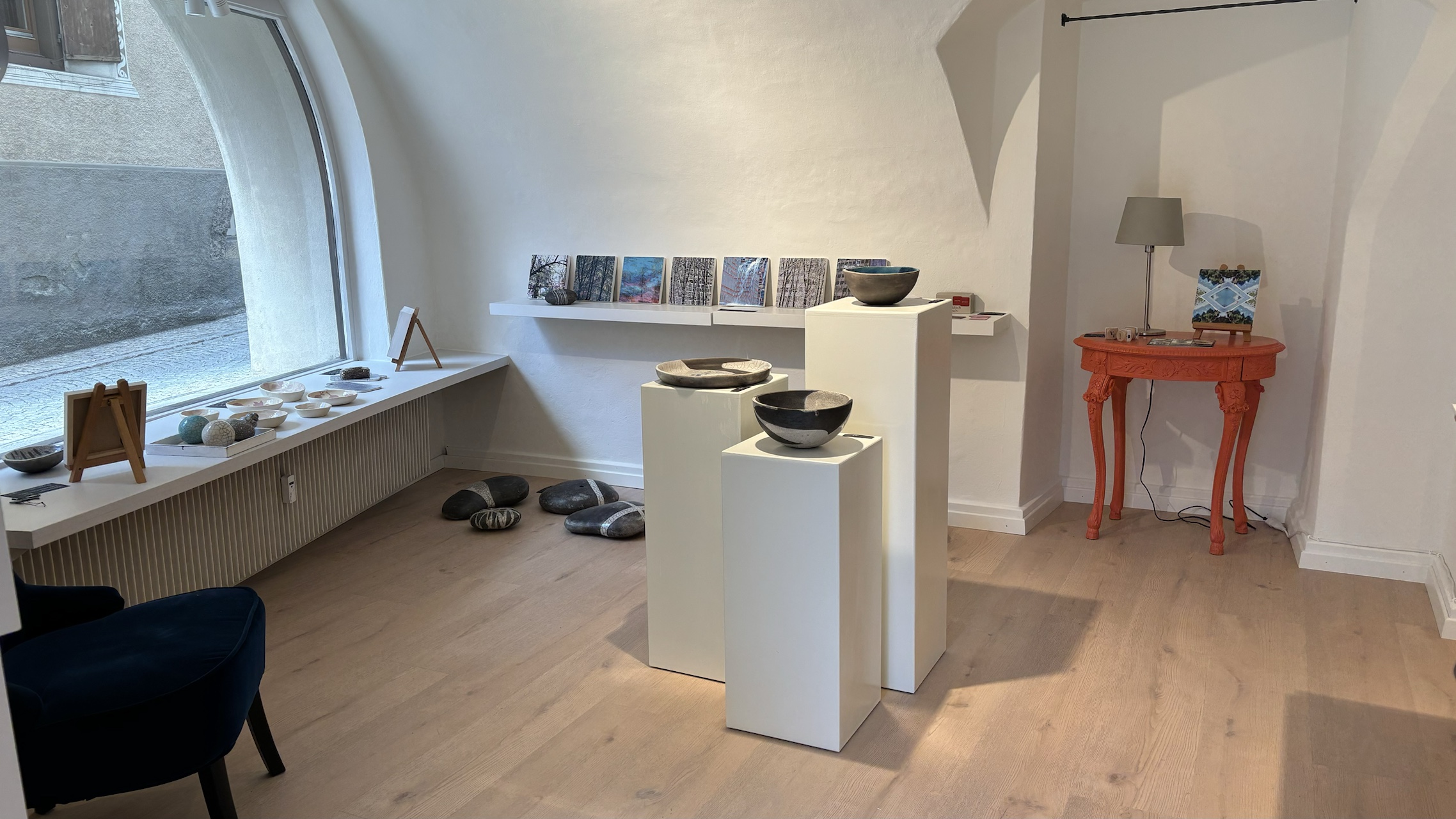 In unserem kleinen Atelier in Zuoz entstehen Objekte, Schalen, Vasen und Teller, inspiriert von der wunderbaren Bergwelt des Engadins. Jedes Stück wird von der Formgebung, Dekoration und Bemalung über die Glasur bis zum fertigen Brand in Handarbeit gefertigt. Sie erhalten also immer ein Unikat.